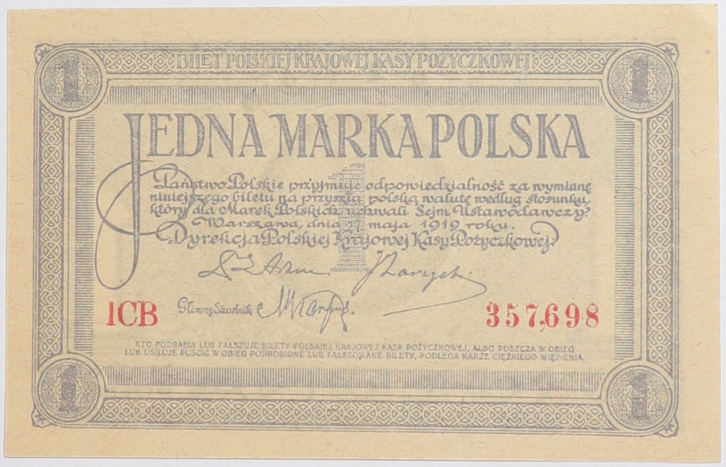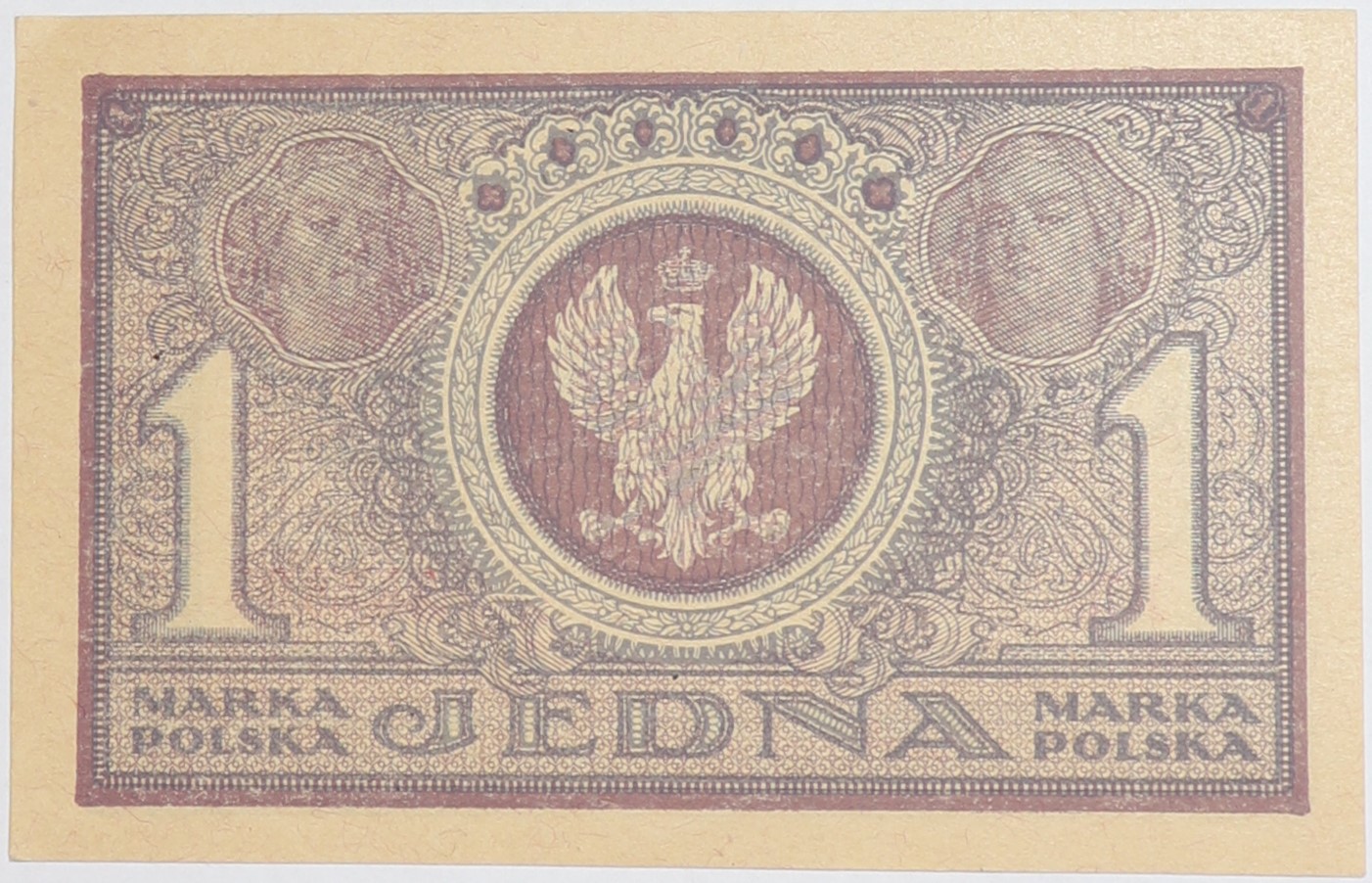 Banknot 1 Marka Polska 1919 rok. Stan Bankowy UNC.