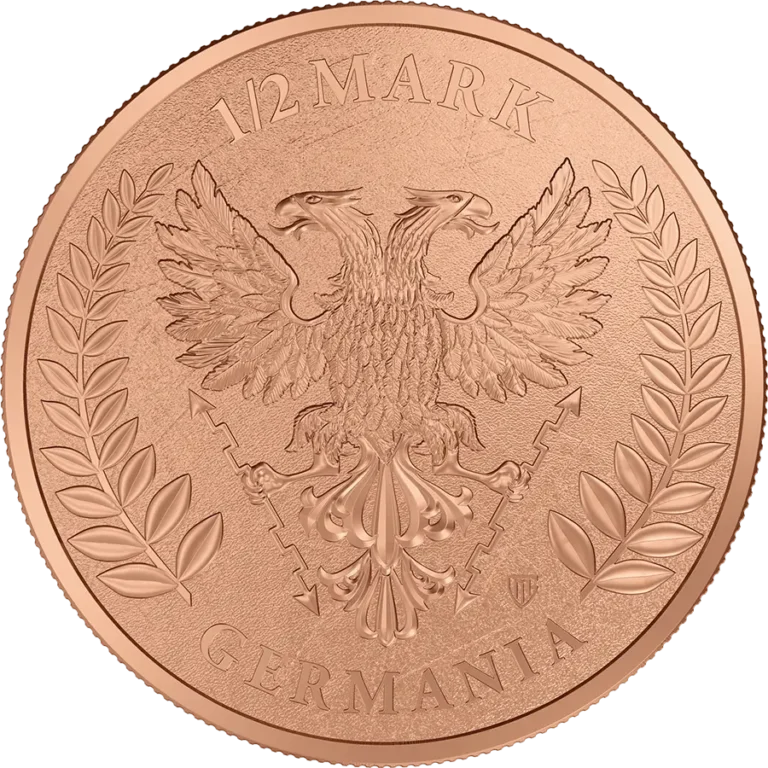 Awers monety przedstawia Germanię zasiadającą na tronie, z mieczem i tarczą, w królewskiej koronie oraz w towarzystwie dwóch kruków.