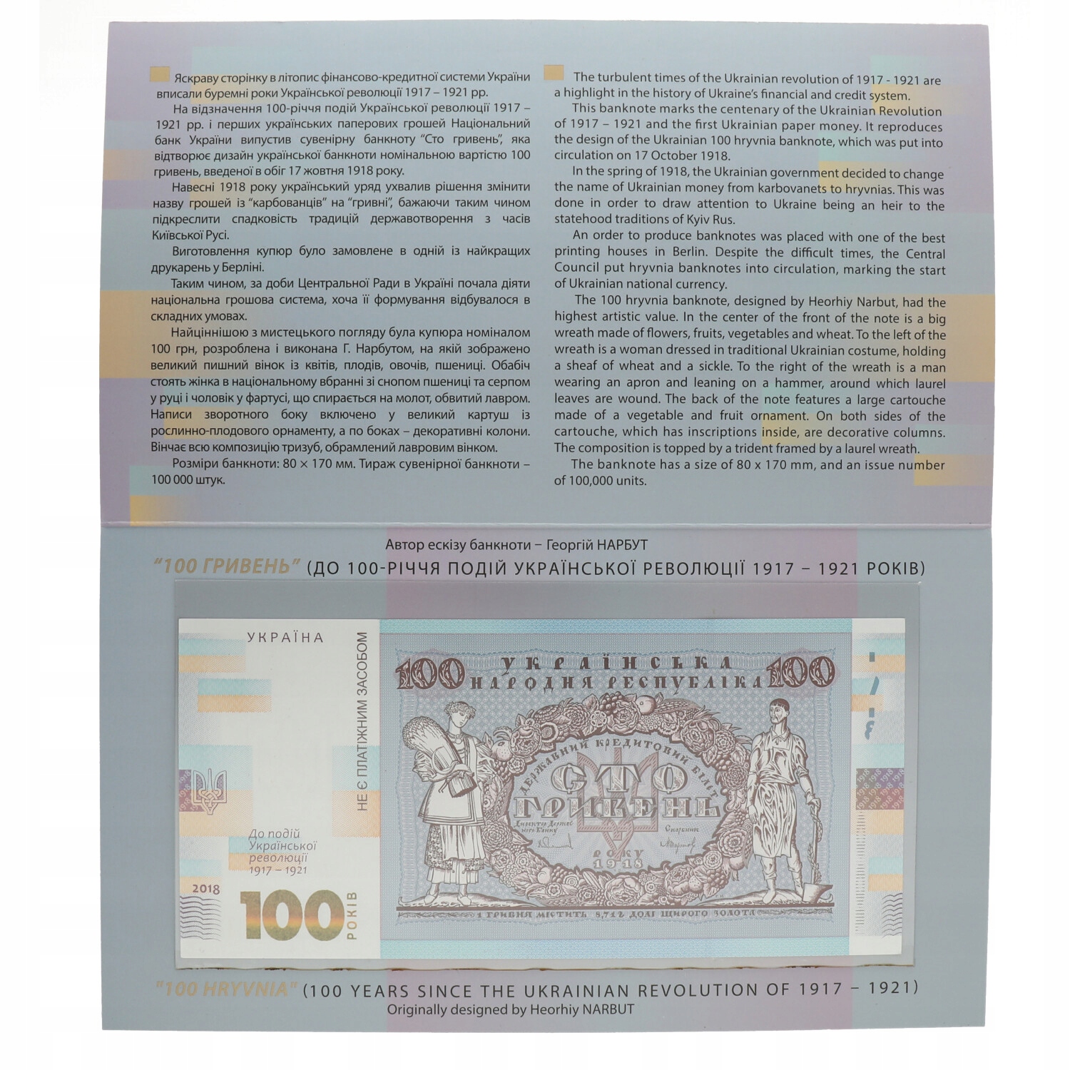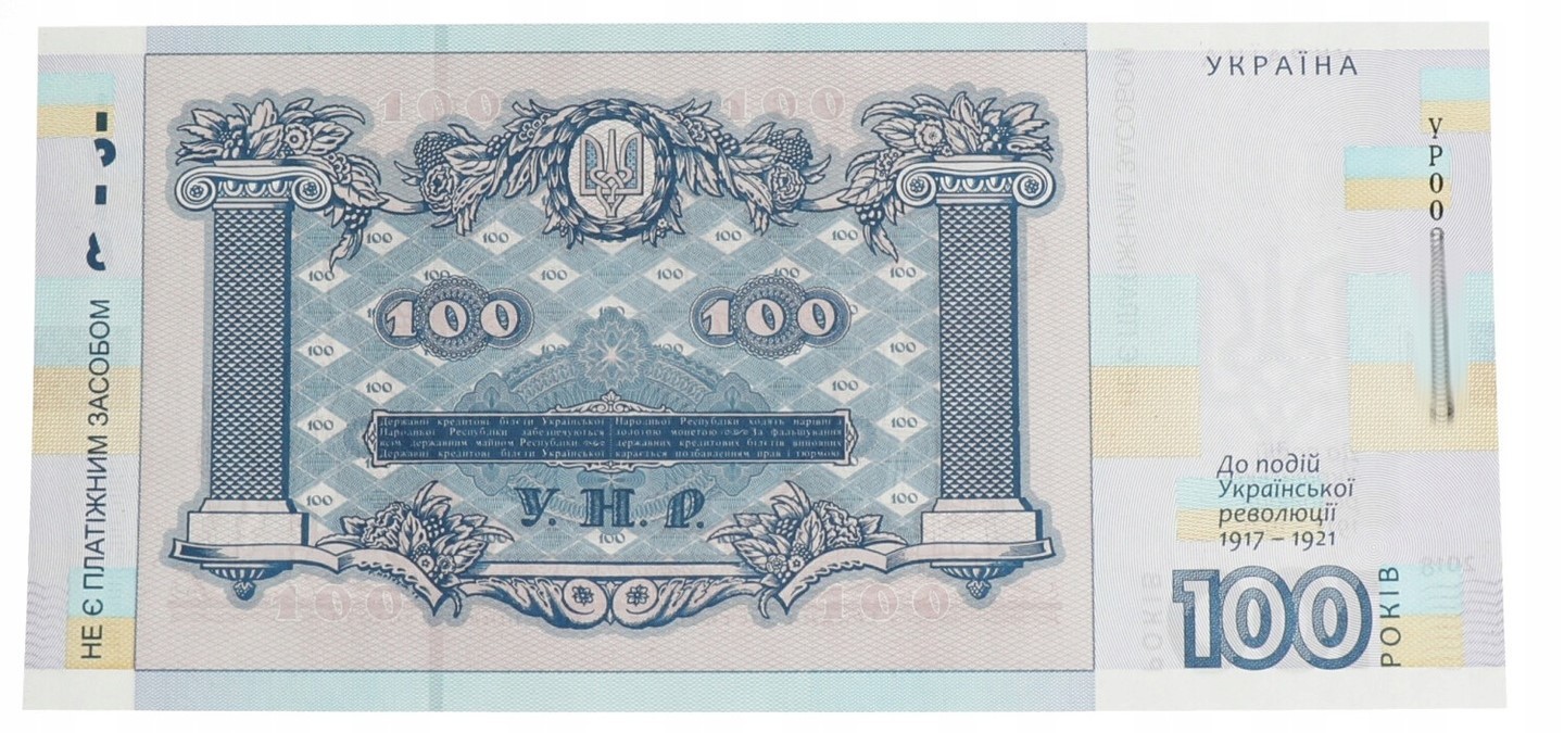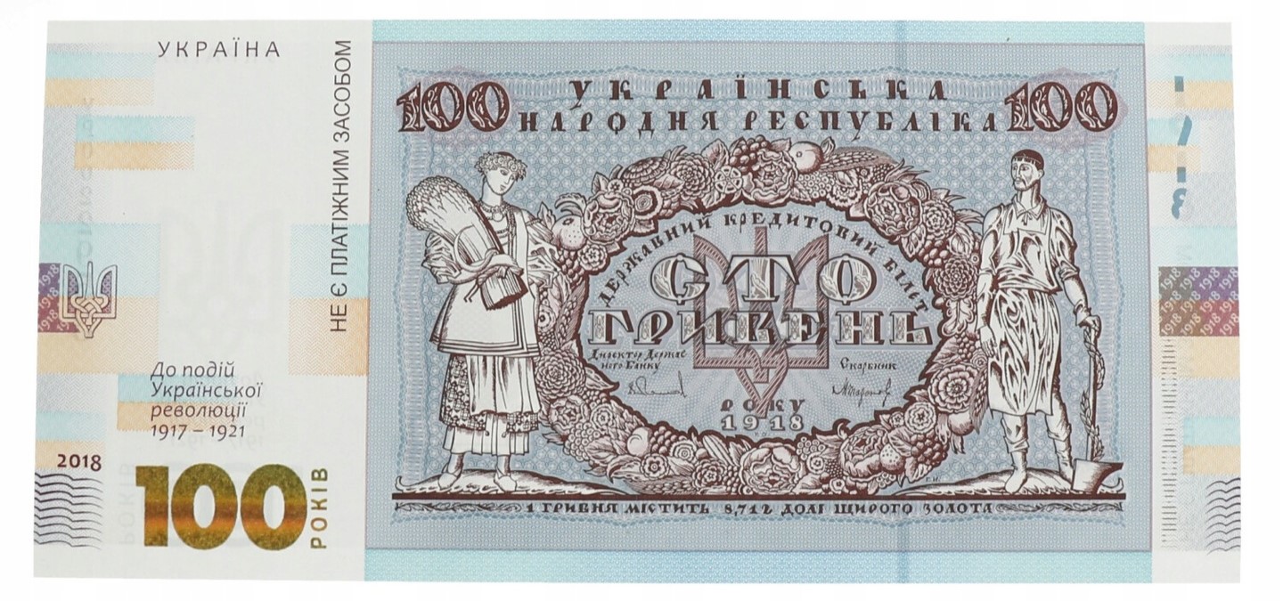 Banknot ten odtwarza projekt ukraińskiego banknotu 100 hrywien, który został wprowadzony do obiegu 17 października 1918 r. Wiosną 1918 r. rząd ukraiński podjął decyzję o zmianie nazwy ukraińskiego pieniądza z karbowańców na hrywny. Miało to na celu zwrócenie uwagi na to, że Ukraina jest spadkobiercą tradycji państwowych Rusi Kijowskiej. Banknot 100 hrywien, zaprojektowany przez Heorhiya Narbuta, odznaczał się najwyższym poziomem artystycznym.