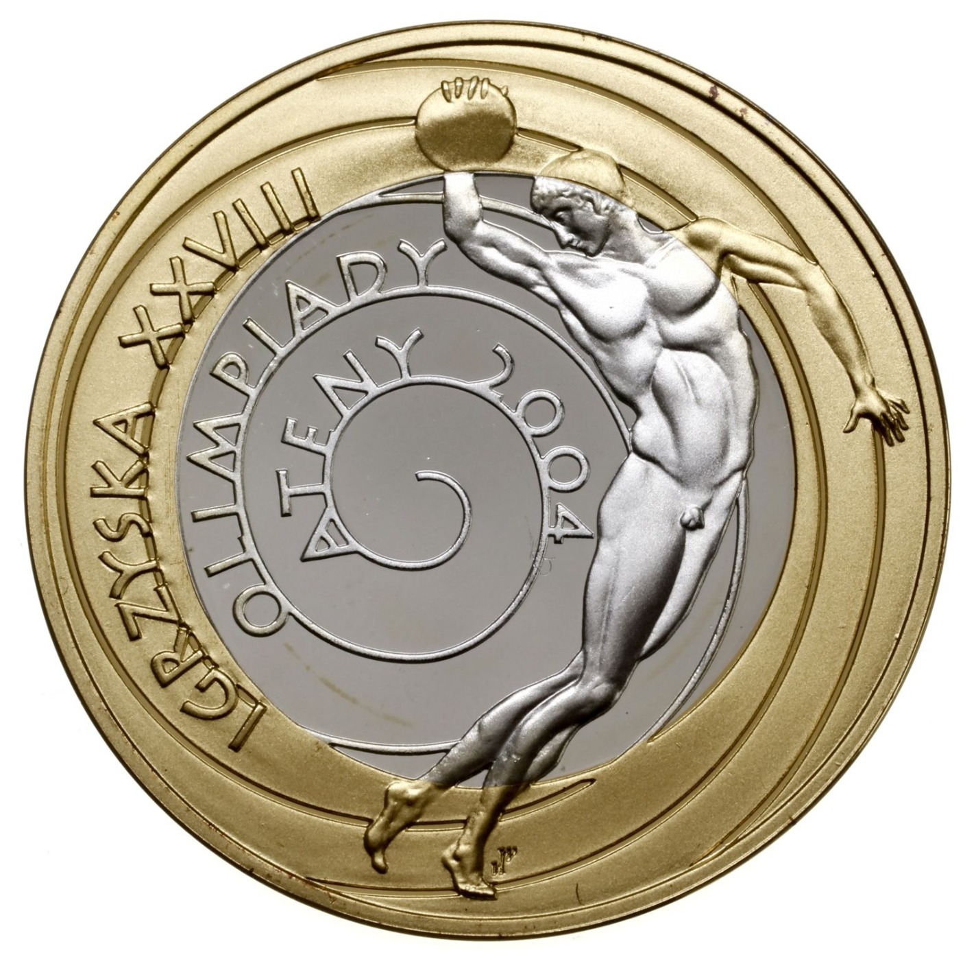 Moneta została wyemitowana, aby upamiętnić Igrzyska XXVIII Olimpiady – Ateny 2004. Na rewersie widnieje wizerunek dyskobola z amfory panatenajskiej. Moneta została wykonana z dwóch rodzajów stopów srebra (Ag 925) oraz złota (Au 999). Moneta jest platerowana.
