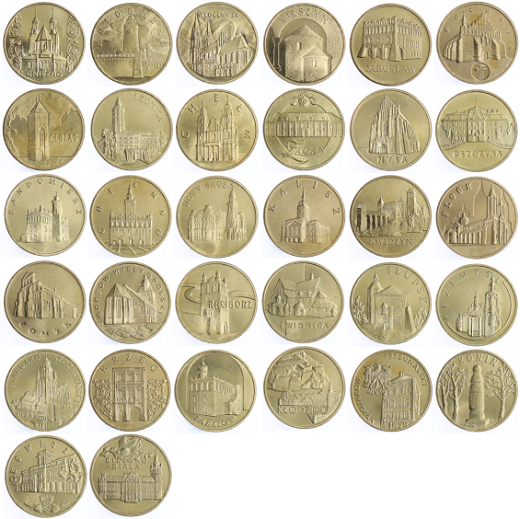 Komplet zawiera wszystkie monety okolicznościowe z serii Historyczne Miasta w Polsce o nominale 2 złote wyemitowane przez Narodowy Bank Polski w latach 2005-2008. W komplecie znajduje się zestaw trzydziestu dwóch monet 2 złotowych. Istnieje również możliwość zakupienia monet poza kompletem.